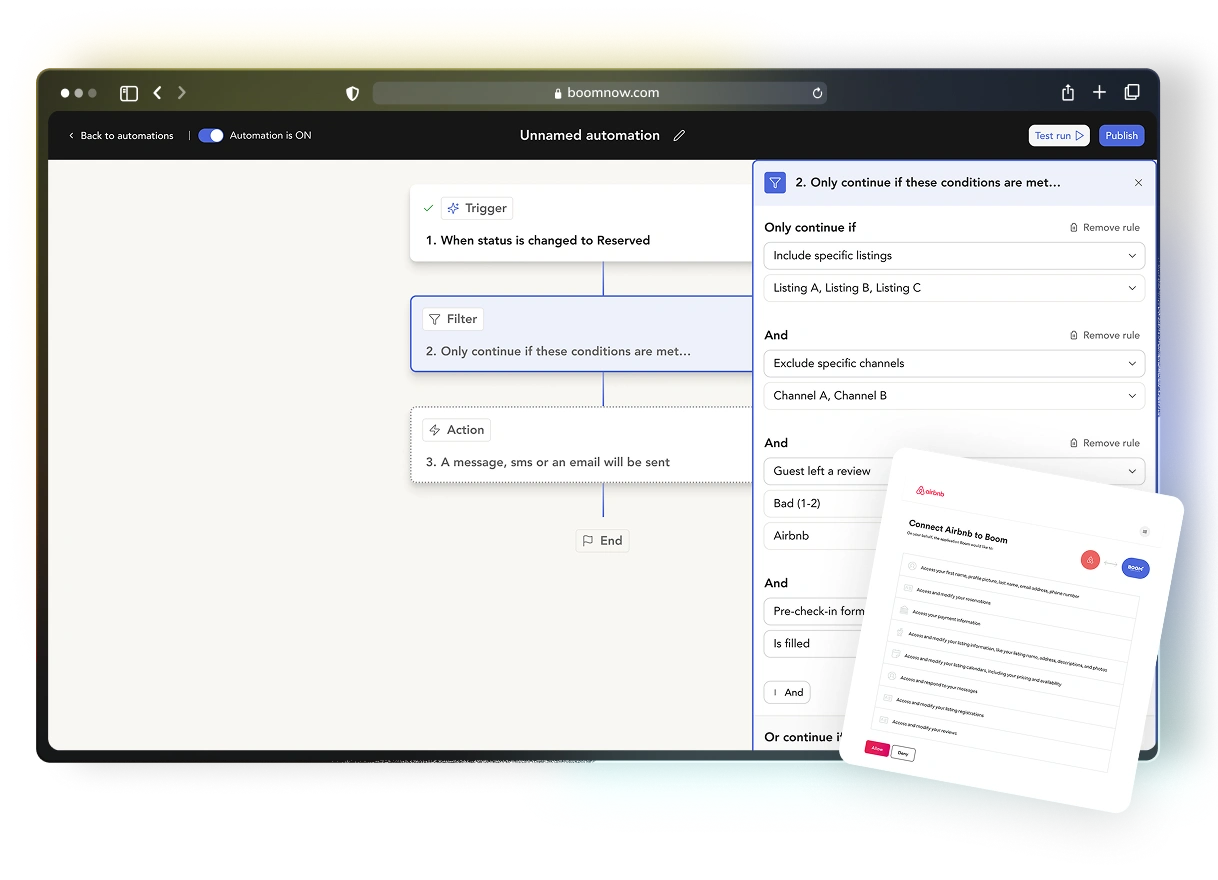 Boom offers robust guest communication tools that allow you to automate messages, send personalized emails, and manage inquiries efficiently. This ensures timely and professional communication with guests, enhancing their experience and increasing the likelihood of positive reviews and repeat bookings.